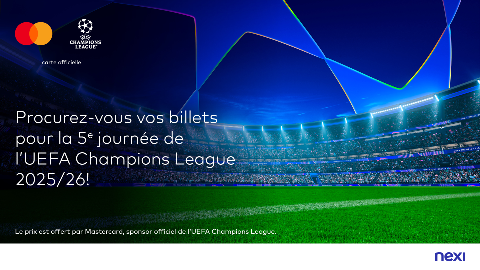 Avec un peu de chance, vivez la UEFA Champions League 2025/26 en direct au stade ! Grâce à Mastercard, sponsor officiel, Nexi Suisse met en jeu une expérience exclusive pour deux personnes – incluant :