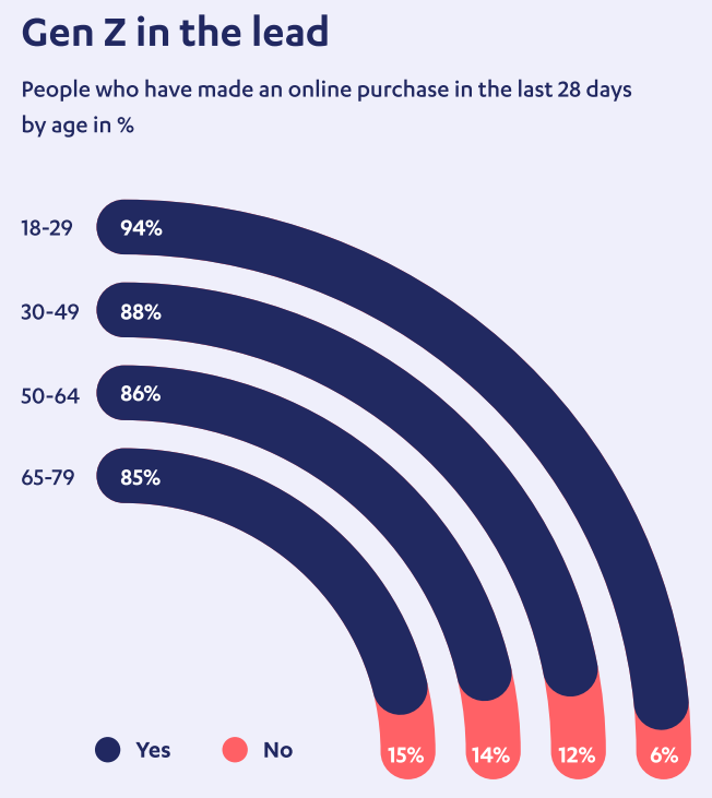 - «Le commerce en ligne a connu une forte croissance pendant la pandémie et s’est établi dans toutes les tranches d’âge. Aujourd’hui, 85 % des personnes âgées de 65 à 79 ans font des achats en ligne. Chez les 18 à 29 ans, cette proportion atteint 94 %», déclare Marianne Bregenzer, Country General Manager de Nets Suisse SA