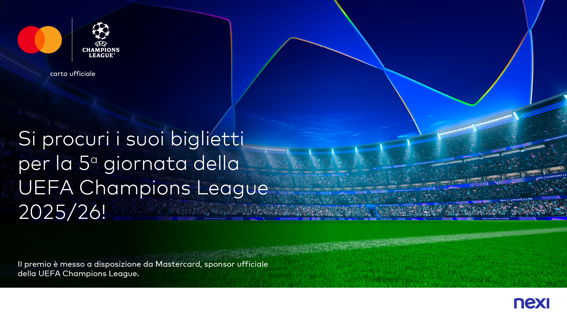 Con un po’ di fortuna potrai vivere la UEFA Champions League 2025/26 dal vivo allo stadio! Grazie a Mastercard, sponsor ufficiale, Nexi Svizzera mette in palio un’esperienza esclusiva per due persone – inclusi: